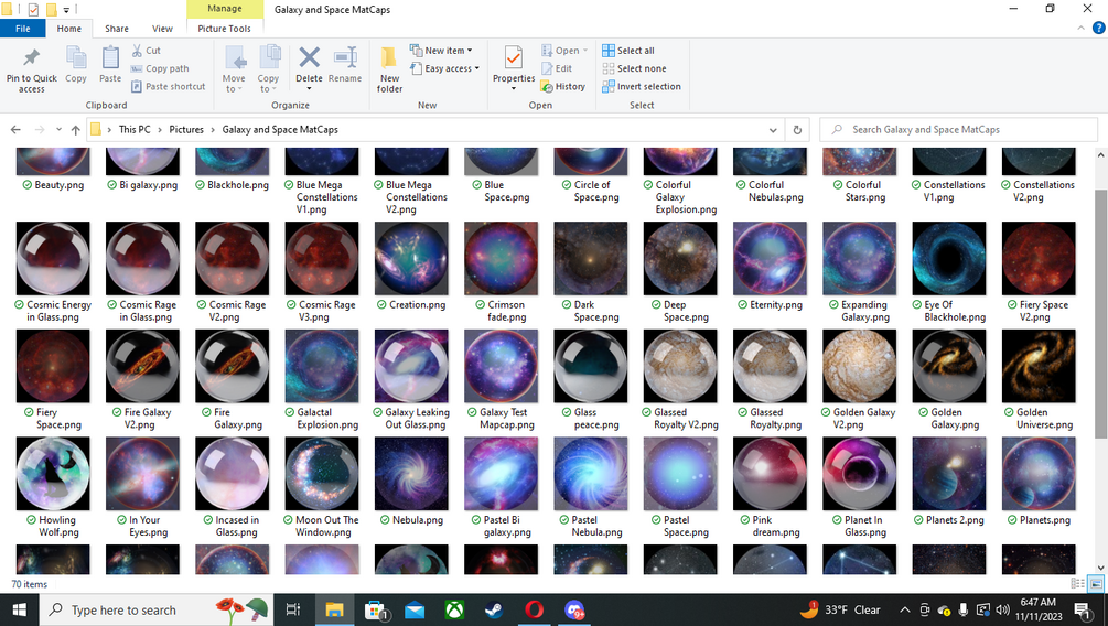 A bunch of Galaxy and Space inspired MatCaps, intended for VRChat projects but perfectly useable in any project.
